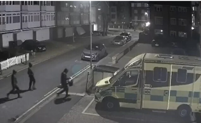 Hooded people approach ambulances belonging to the Jewish Hatzola organization before torching them, in Golders Green, London, March 23, 2026. (Screenshot: X)