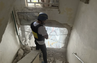 Home Front Command chief Maj. Gen. Shai Klapper (left) is seen alongside other officers at a home in central Israel hit by an Iranian cluster bomb munition, March 9, 2026. (Israel Defense Forces)
