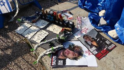 Pictures of men and women, boys and girls and children and babies that were kidnapped to Gaza on the fence of Sportek Nesher - war of iron swords (Creative Commons)
