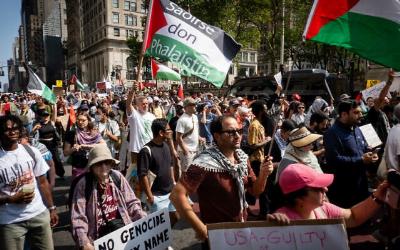 Protest signs accuse Israel of genocide, at the United Nations Headquarters in New York City, August 28, 2025. (Luke Tress/Times of Israel)