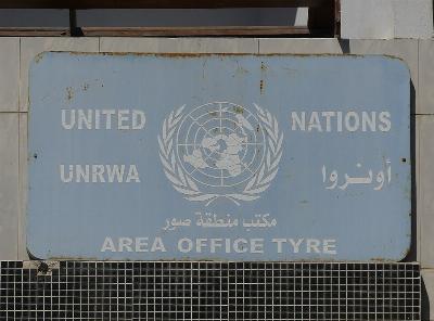 Sign of the area office of the United Nations Relief and Works Agency for Palestine Refugees in the Near East (UNRWA) in Tyre/Sour, Southern Lebanon.